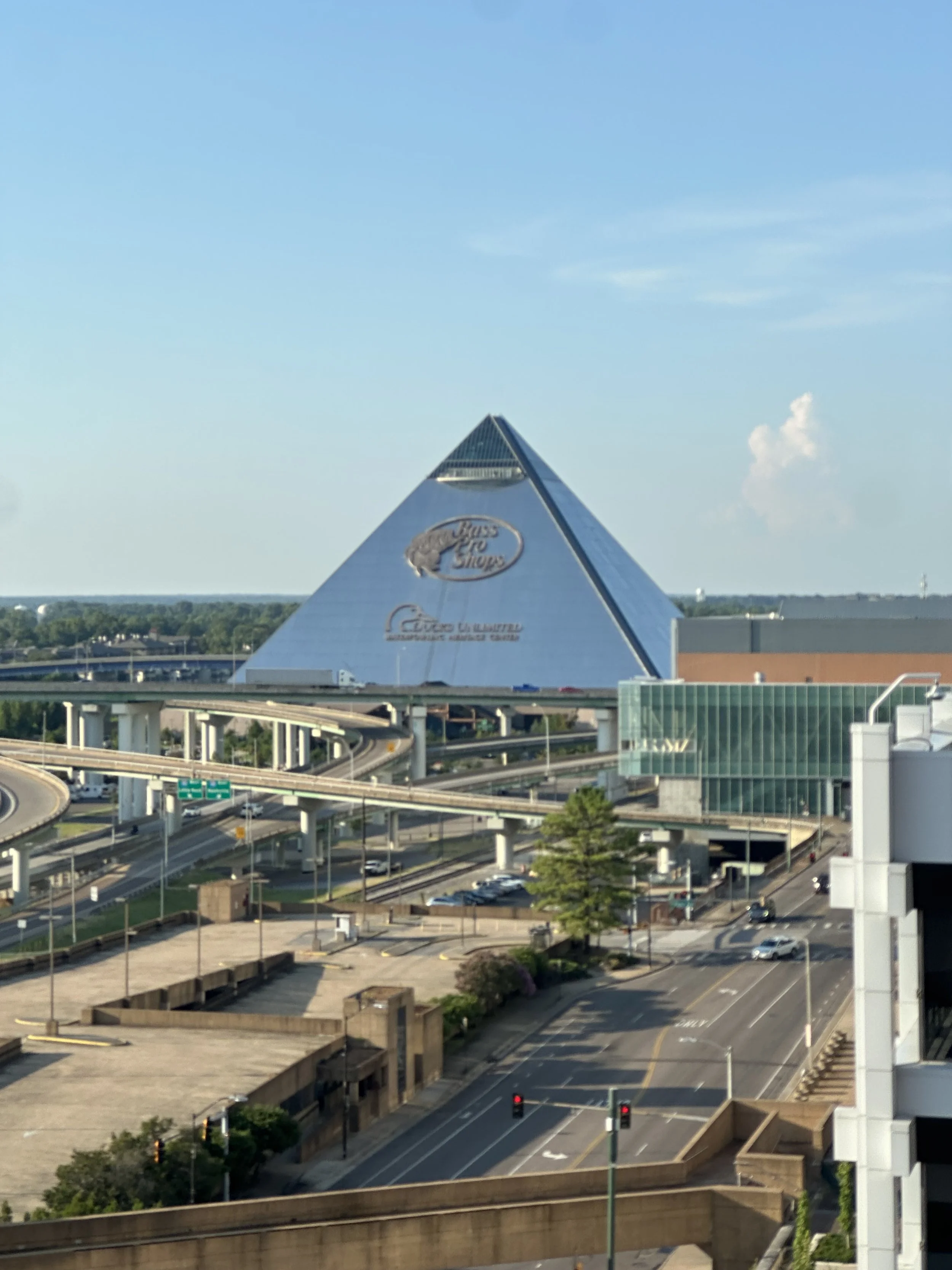 The “Great American Pyramid” known as the Bass Pro Pyramid, formerly a sports arena. Its look was inspired by the Egyptian Pyramids and due to it being in Memphis, known as the City on the Nile of the new world